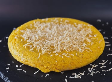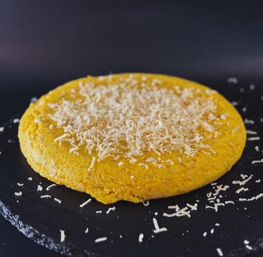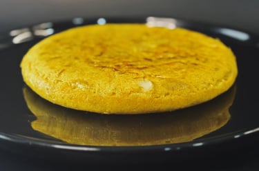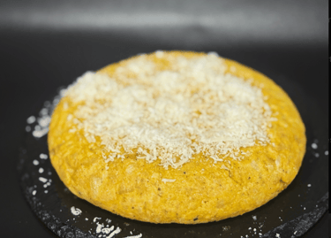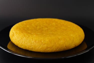 Tortilla cremosa con Queso de Cabra en rodajas y cebolla caramelizada.