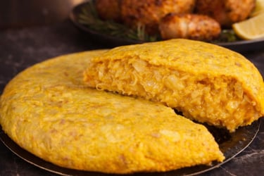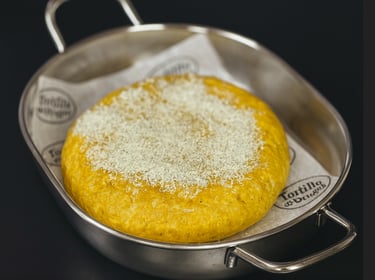 Tortilla cremosa con rulo de Queso de Cabra y cebolla caramelizada.