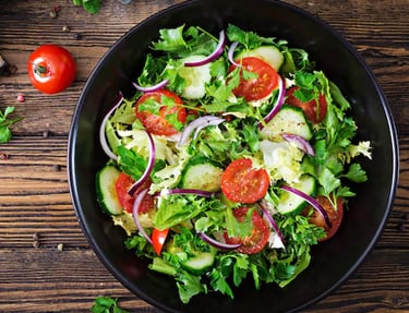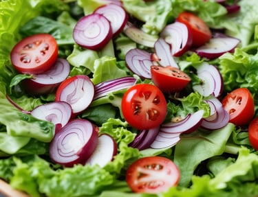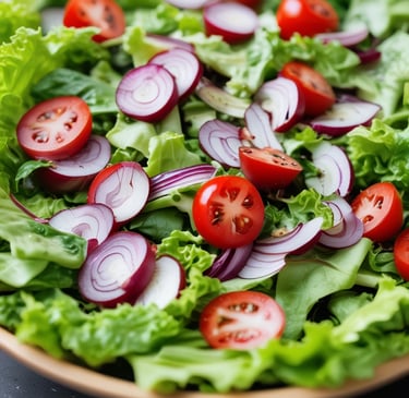 Lechuga, tomate y cebolla morada y nuestra vinagreta de AOVE y Vinagre D.O.P Módena.