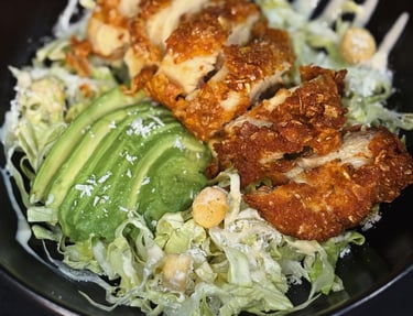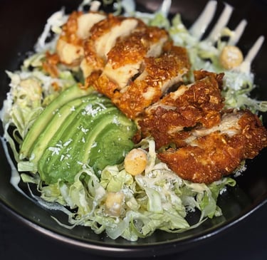 Lechuga Romana finamente cortada, aguacate, picatostes, parmesano y contramuslo de pollo extra crispy