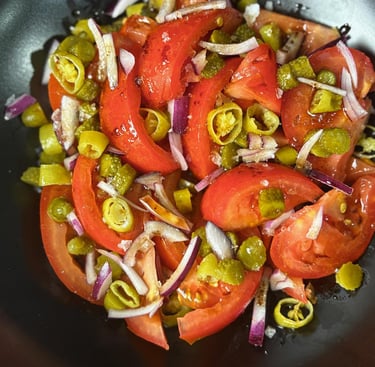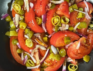 Tomate con encurtidos (pepinillos y piparras) finamente cortados y cebolla morada
