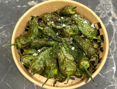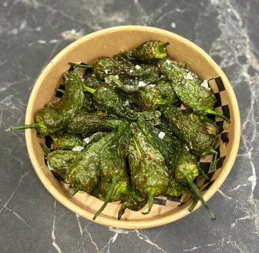 Tortilla al punto (con o sin cebolla), queso arzúa-ulloa, Pimientos de Padrón y salsa a elegir.