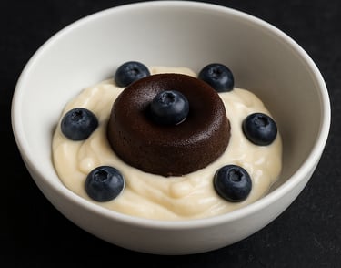 Coulant de chocolate , servido sobre una cama de crema de mascarpone de vainilla de Madagascar y arándanos frescos.