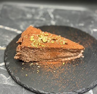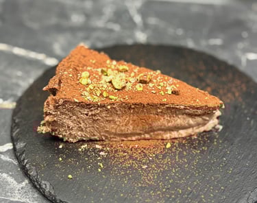 Tarta de queso super cremosa, estilo "La Viña" de chocolate con pistachos.