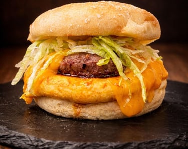Tortilla cremosa con vaca rubia gallega, cheddar y lechuga.